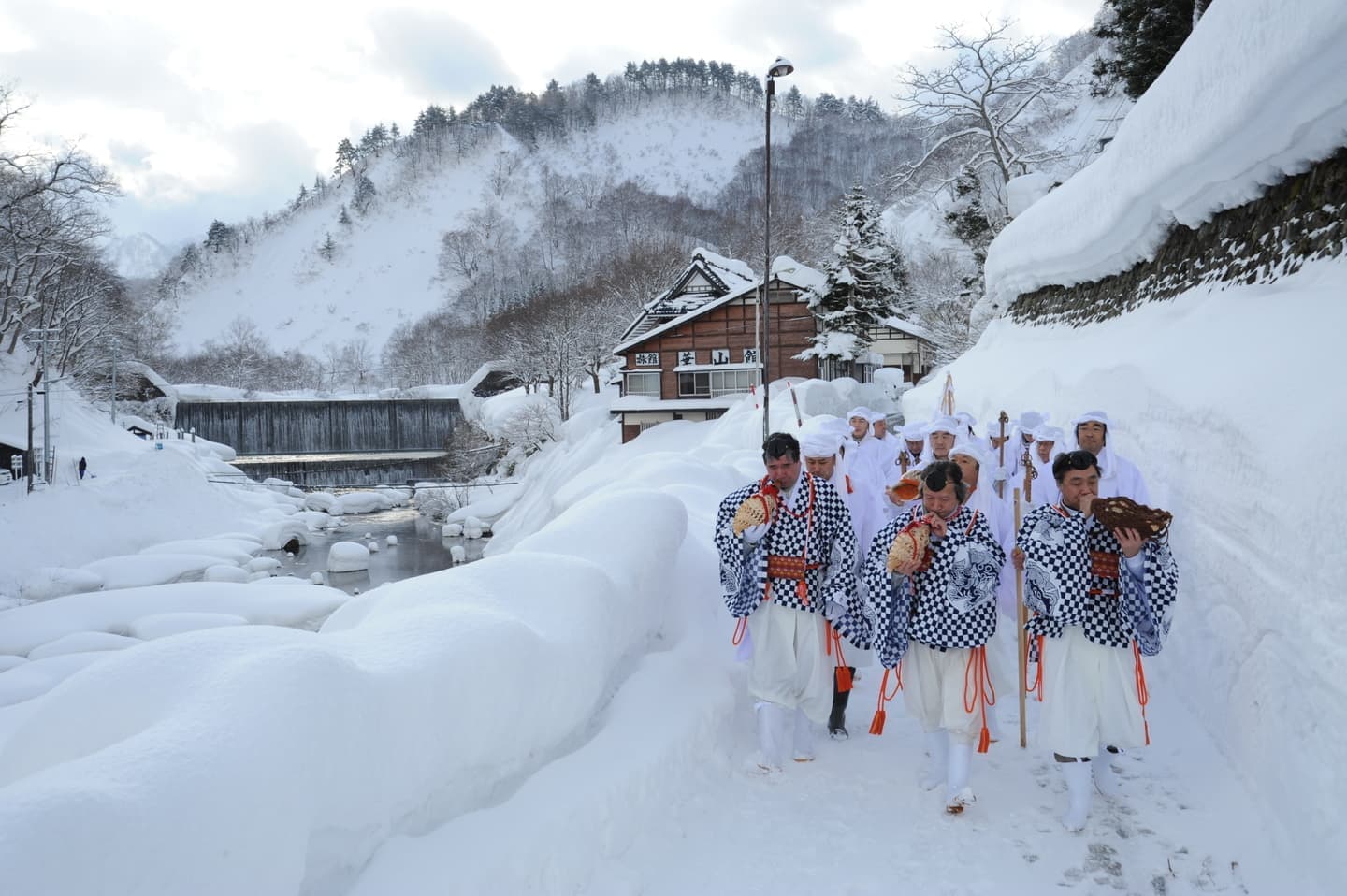 出羽三山に古くから伝わる山伏たちの年越行事。白装束に身を包み、五穀豊穣、無病息災を祈願し、法螺貝の合図で温泉街を練り歩きます。来場者につきたて餅の振る舞いもあります。