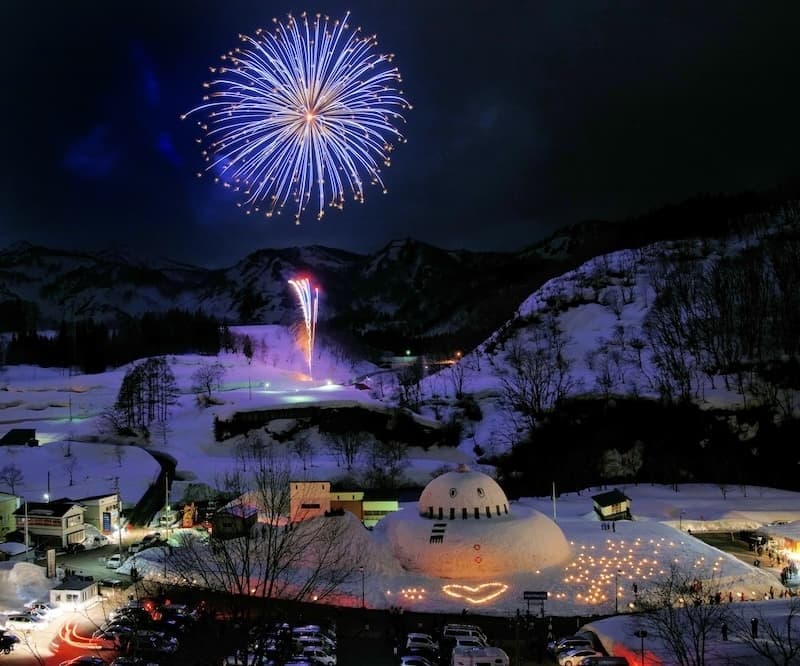 大蔵村の冬の風物詩。幻想雪回廊、巨大雪だるま「おおくらくん32世」がお目見えします。また、花火が打ち上がり冬の夜空を彩ります。